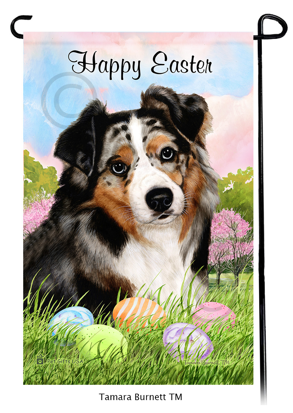 This beautiful Happy Easter garden flag features your Australian Shepherd Blue Merle with the saying "Happy Easter" checking out some Easter eggs. The flag measures approximately 17 3/4" long and 12" wide and is printed on both sides. It features the wonderful artwork of renowned artist Tamara Burnett. You can add the option to personalize the flag with your pet's name, or you can just have the normal saying as shown. They are proudly decorated in the USA! ** Stand is not included **